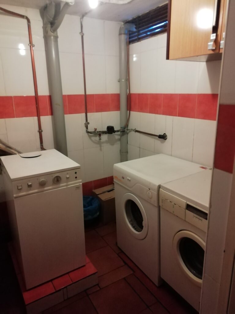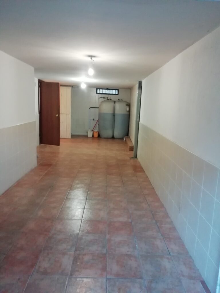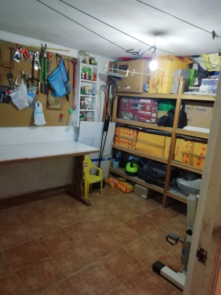 Desde la primera planta podemos acceder al sótano de la vivienda, donde se encuentra la despensa, un cuarto para la caldera de gasóleo y la lavadora y secadora, otro cuarto para usar como taller, gimnasio o lo que se desee y una amplia cochera para dos coches y el depósito de gasóleo (1.000 litros). Desde la cochera se accede a un pequeño patio para tender la ropa.